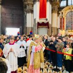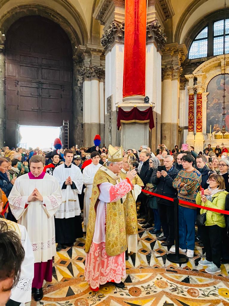 Al termine della Messa il Patriarca è uscito sul sagrato della basilica per benedire la Città e tutti i fedeli che non hanno potuto ad accedere alla Basilica. L’audio è stato amplificato anche all’esterno per una più estesa partecipazione.