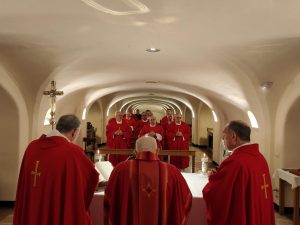 Poco prima dell’incontro con Papa Francesco i Vescovi del Triveneto avevano celebrato la S. Messa presso la Tomba di san Pietro, lì hanno cantato il Credo e visitato le tombe dei Papi. “Celebrare vicino alla Tomba di san Pietro - ha detto l’Arcivescovo di Udine Andrea Bruno Mazzocato che ha presieduto la S. Messa - è stata l’occasione per ricordare che da lì parte la nostra fede e parte anche il nostro ministero di Vescovi che continuano ad annunciare la stessa fede in Cristo, una volta che l’abbiamo fatta ancora nostra e rinnovata”.